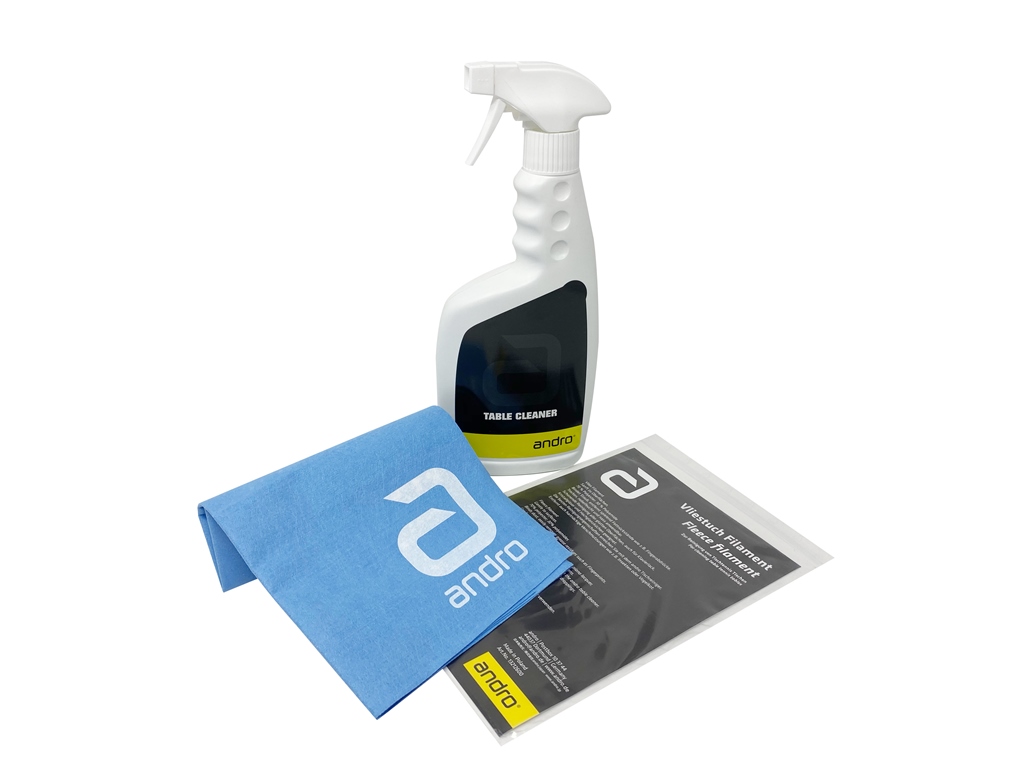 Keep your table in perfect condition with the original andro table cleaning set. Regular use of the cleaning solution extends the life of the playing surface and preserves optimal playing characteristics – consistent bounce, grip, and cleanliness.